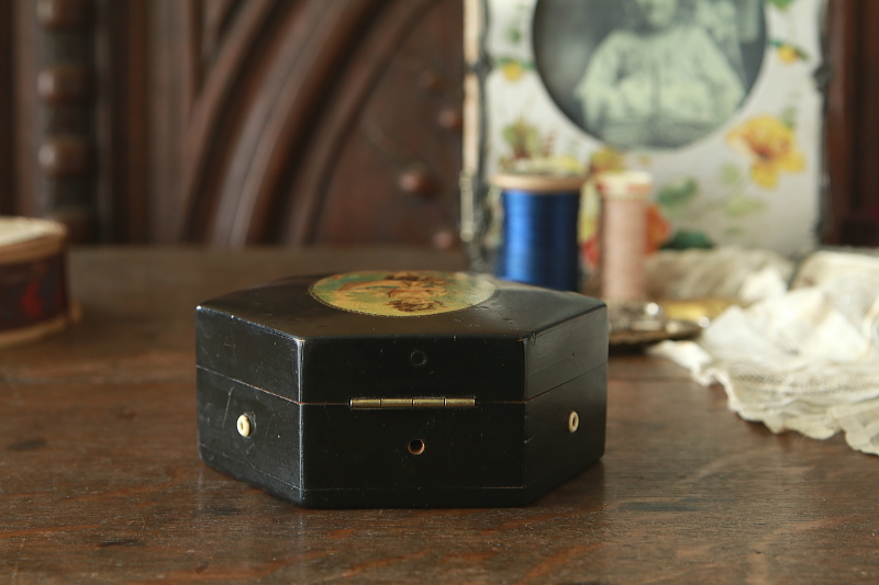 ★A&C15594 モシュリンヌボビンケース W11.5,D10,H14.8cm / 送料:Aランク 【送料ページはこちら】 ◆ご注文方法はこちら◆ 黒く塗装された六角形の小さな木箱。蓋の中央には花を集める少女のプリントがかわいらしい、過ごした時間を偲ばせる古びた風合いが魅力の品。蓋を開くと六つの面には小穴が開けられ、糸を引き出せるように作られたボビンケースになっており、裁縫道具のコレクターにもおすすめの面白いひと品です。小穴にはボーンのハトメを付け、蓋の開閉もスムーズで、精度よく丁寧に作られた小箱だと思います。1900年頃のイギリスから。 蓋の表面に小さな凹みがいくらか見られますが光を当てて分かる程度です。背面のハトメが1ヶ所なくなっていますが目立ちません。全体にしっかりした状態です。 華やかな装飾の裁縫道具をご紹介しています。ページ下部のリンクからご覧ください。 |