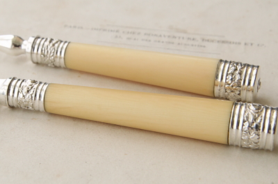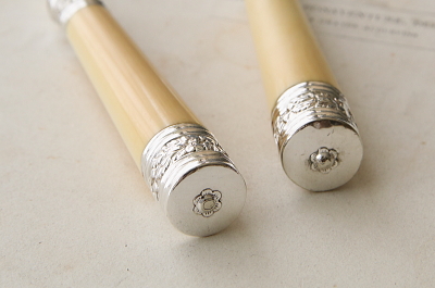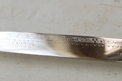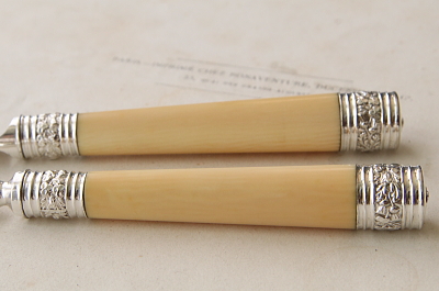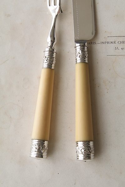 ★A&C15926 エングレービングのデザートナイフ&フォーク アイボリーハンドル A&C15926-A~G共: ナイフ:L20cm(40g) フォーク:L17cm(35.5g) / 各¥12,000.-〔税込み・送料別〕 送料:Aランク 【送料ページはこちら】 ◆ご注文方法はこちら◆ 中央に向かって絞った円筒の象牙ハンドル。シルバープレートのブレードには、アザミやシャムロックなど植物模様が浅いハンドエングレービングとエッチングで淡々と描き出され、ハンドル両端のデコラティブに打ち出されたバラをはじめ連合王国の花模様の輝きが、端正な造形に華やぎを与えます。象牙という素材ならではの滑らかな手触りや、確かな持ち重り。うっすら浮かび上がる自然な模様が如何にも贅沢で、手にして感じる心地良さも味のうちと言えるでしょう。19世紀大英帝国から、ヴィクトリア朝時代の贅を尽くしたデザートナイフ&フォークです。 何れもシルバープレートの表面に小キズが幾らか、ナイフエッジにシルバープレートの捲れがほんの僅かに見られますが、時代を鑑みれば良好なコンディションと言えます。ぐらつきなどない、しっかりした状態のものだけをご紹介しています。フォークとハンドルをニカワで接着していると思われます。湯水に長時間浸けたり煮沸すると、ニカワが溶けますので注意して下さい。食洗機不可。 アイボリーハンドルの贅沢なカトラリーと、マザーオブパールハンドルの華やかなデザートナイフ&フォークをご紹介しています。ページ下部のリンクからご覧ください。 |