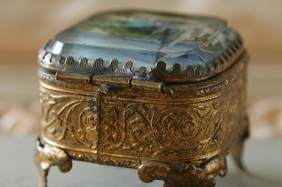 ★A&C15950 厚ガラスのジュエリーボックス LOURDES W5,D6.2,H5cm / ¥21,800.-〔税込み・送料別〕 送料:Aランク 【送料ページはこちら】 ◆ご注文方法はこちら◆ 厚みのあるガラス越しに、ルルドのバシリカが描かれた、小さなジュエリーボックス。聖母マリアが顕現された奇跡にちなんで建立された、尖塔が印象的な聖堂を、やわらかな発色の印刷で表現して可愛らしい。唐草のレリーフが浮かぶメタルのボディや金褐色のサテンクッション、厚紙の底面なども、経年の風合いを纏って好ましい。1900年頃のフランスから。 ガラスのカットのエッジに、引っかかり程度の細かな欠けがいくらか見られますが、よく見ないとわからない程度です。写真のジュエリーは付属しません。 様々なデザインのジュエリーボックスをご紹介しています。ページ下部のリンクからご覧ください。 |