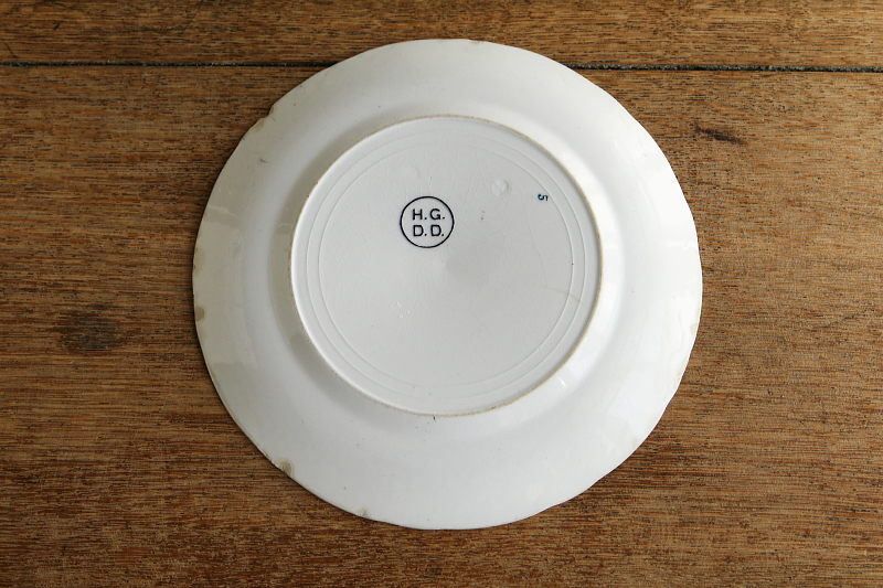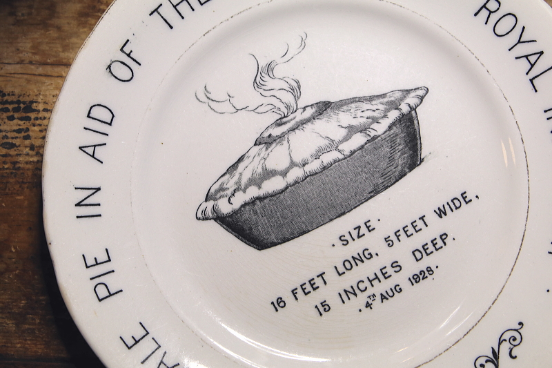 ★A&C15973 デンビーデールのパイ絵皿 1928 W24,H2.3cm / 送料:Aランク 【送料ページはこちら】 ◆ご注文方法はこちら◆ 白地に黒の転写プリントでパイが描かれた絵皿。デンビーデールの伝統で、国の一大事に祈願や祝意を込めて、巨大なパイを作る行事があるのだそう。最初は1788年にジョージ3世の病状回復を祈願して、他に1887年のヴィクトリア女王のゴールデンジュビリーを祝って、2000年には2千年紀を祝ってなど。ご紹介の皿は1928年に、王立病院への募金のために催された時の物だそうで、この時は16フィート×5フィートと有りますから、4.9×1.5メートルのサイズで作られました。そんなイベントの記念品がこちらの絵皿。釉薬全体に貫入や表面のキズ、スレ、裏の縁には欠けがいくらも見られますが、100年近くも昔の、愉快なお祭りのイメージに似合う古ぼけた表情も魅力です。 釉薬への貫入、表面のキズが全体に見られます。 ヴィクトリア女王のジュビリーを祝うティーカップやタンブラーをご紹介しています。ページ下部のリンクからご覧ください。 |