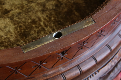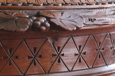 ★A&C15978 薔薇を飾るウォールナットジュエリーケース W33,D27.5,H15cm / 送料:宅配便送料無料〔3万円以上〕 ◆ご注文方法はこちら◆ 天辺に薔薇と花々が飾られた、オーバルの木彫の小箱。小箱と言っても両手でないと持てないほどの堂々とした体躯で、木目の詰まったソリッドウォールナットの重みにも高級感が漂う豪奢な佇まいです。 まずは、蓋に一段盛り上げられた天辺の花々の彫刻に目が行きますが、小作りで女性らしいムードです。オーバルの本体は筒状にくり抜かれた、贅沢なソリッドウォールナットにラティス調の線彫りが愛らしく、底板には縁に蔦の彫刻が、周囲に大きくせり出すように一部は透かし彫りで表現され、足元の広がりが、地に根を張るような、堂々とした安定感で全体を力強くまとめています。 端々に、細かな彫刻が豪華に飾られた作品ですが、彫刻の端に目立たない欠けがいくらか見られる程度で、大きなダメージなく残ったのは非常に幸運でした。内部は当店で、アンティークベルベットを使って張り替えました。1900年頃のフランス製。 彫刻の端にいくらか欠けが見られ、経年の乾燥によるひびが数か所ありますが、大きなダメージはなく、伝統的なアンティーク塗装直しをしていますので、細かなダメージも気にならないと思います。 様々なデザイン、素材のジュエリーボックスをご紹介しています。ページ下部のリンクからご覧ください。 |