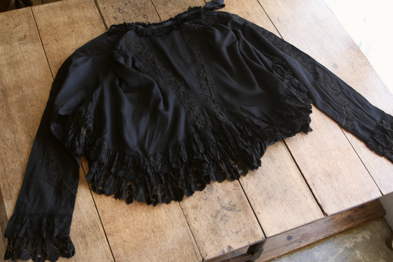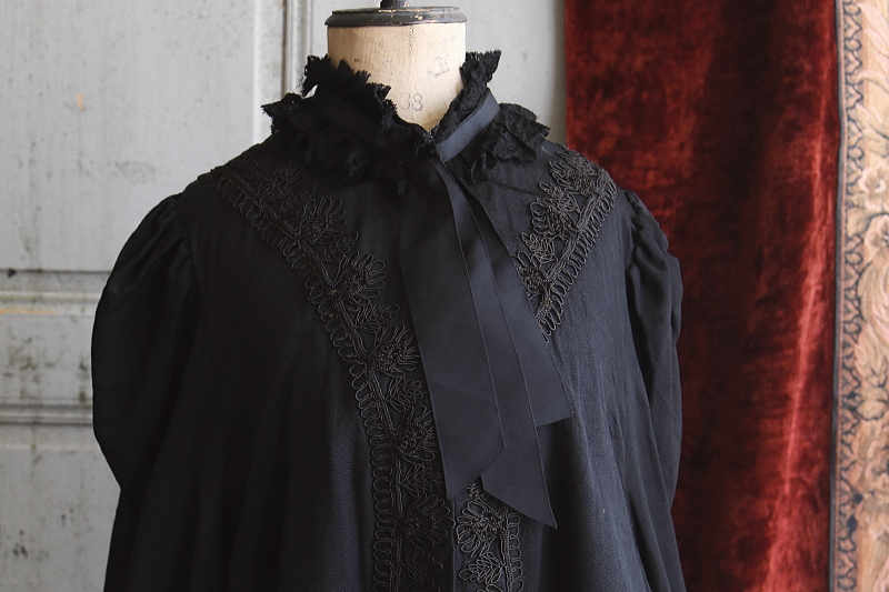 ★A&C15981 ブラックシルクのケープ 全長:113cm 着丈(背部):73cm 肩幅:38cm / ¥46,000.-〔税込み〕 送料:宅配便送料無料〔3万円以上〕 ◆ご注文方法はこちら◆ シルクならではのなめらかな光沢が、黒一色のの中に流れるようなケープ。生地のテクスチャーや線描のような刺繍、レースやリボンを添えた、フェミニン肩に羽織るように着て、前立のフックで合わせます。袖がないので、前身頃の長い部分の、横から腕を出すようです。表地、裏地、レースやリボンと、総シルクの贅沢なケープはフランスのモンベリアルのブティックのもので、1900年頃の古い時代の衣装です。裏地やレースに穴や破れ、繕いが幾らか見られます。写真以外にもレースの穴や繕いが有りますが、ドレープに紛れてあまり目立ちません。表地には目立つダメージが見られず縫製もしっかりしていますが、100年以上も昔の服なので扱いにご注意ください。当店でクリーニング済みです。 華麗な花がらのシルクのマットをご紹介しています。ページ下部のリンクからご覧ください。 |