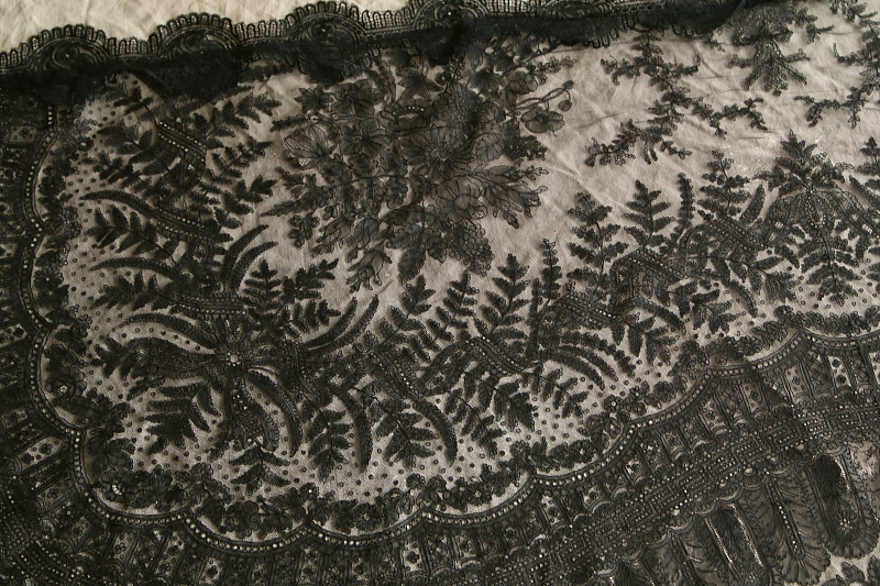 ★A&C15998 ヴィクトリアン ブラックチュールレースショール W190×H80cm / 送料:Aランク 【送料ページはこちら】 ◆ご注文方法はこちら◆ たっぷりとしたチュールレースをキャンバスに、渋く華やかな花模様を描く一枚。当時好まれたシダや古典的な手の込んだ装飾模様が、隆盛を極めた時代を思わせます。大人の為の花模様として愉しみたい、19世紀ヴィクトリア時代のイギリスの品。おそらくシルクだと思われます。デリケートなチュールレースの宿命ですが、穴やほつれが少なからず見られますが、大判の古いチュールレースが原型を留めて残っているのは、今や希少な存在です。絵柄の優雅さをご堪能下さい。 (状態については、出来る限り注意深く確認しておりますが、見つけきれなかった小さな染み、薄い染み、僅かな糸切れ等、目立たない小さなダメージがあることもございます。何卒ご容赦ください。) 黒いシルクのケープをご紹介しています。ページ下部のリンクからご覧ください。 |