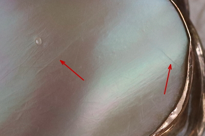 ![]() 自然由来の小孔のようなキズが1箇所。薄いヒビが2本見えます。 |