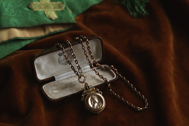 ★A&C16004 ヴィクトリアン ロケットペンダント 24×38mm(丸カン含む)(12.4g) / ¥36,800.-〔税込み〕 天然ブラッドストーン / ガラス / 合金 送料:宅配便送料無料〔3万円以上〕 ◆ご注文方法はこちら◆ 貴婦人の横顔が、経年の落ち着いた輝きに浮かび上がる、ボリュームのあるロケットペンダント。豪華な衣装を纏った威厳のある横顔は、王族か貴族のものでしょう、裏面にはブラッドストーンの、自然石ならではの重みある光沢を愉しめるひと品。11ミリと厚みのあるフレームを開くと、両面にガラスカバーで守られたフォトフレームが現れる、ヴィクトリア時代ならではのロマンティックなアクセサリーです。凝った作りの金具からも、古き良き時代を感じられる、19世紀の英国の品です。 表面のレリーフ中央にゆるやかに凹みが見られます。それ以外は目立つダメージのないきれいなしっかりした状態です。チェーンは付属せず、ペンダントトップのみの販売です。 ロケットペンダントをご紹介しています。ページ下部のリンクからご覧ください。 |