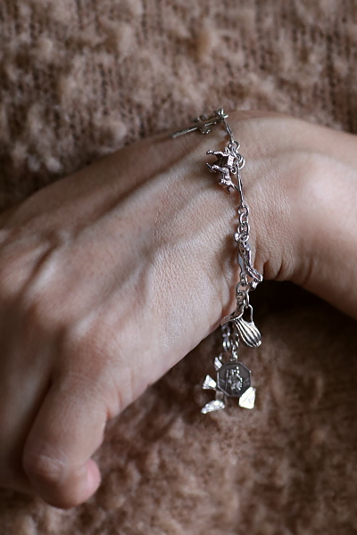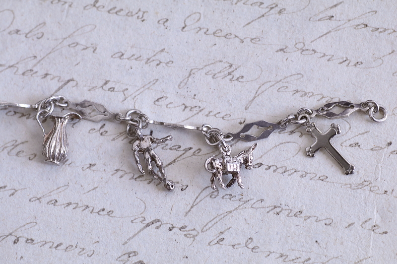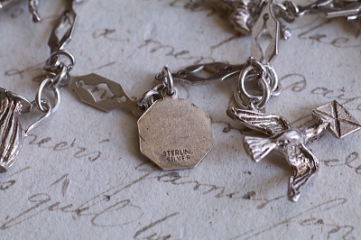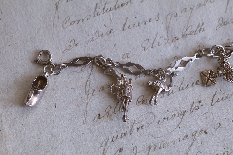 ★A&C16007 9シルバーチャームブレスレット 19.5cm(12.9g) / ¥23,800.-〔税込み・送料別〕 シルバー 送料:Aランク 【送料ページはこちら】 ◆ご注文方法はこちら◆ 凝ったデザインのシルバーチェーンに、9個のシルバーチャームが飾られたブレスレット。手紙を運ぶツバメや、聖クリストフォロスのメダイがやはり目を引きますが、ロバやダチョウなど動物や、木靴やジャグなどの道具類までぶらさげます。サッカー選手や短銃などちょっと珍しいものも面白い、可愛らしいアクセサリーです。軽やかな着け心地のシルバーの重みも心地よい、20世紀中頃のイギリスのヴィンテージ。 チェーンに刻印はありませんが、テスト済みのシルバー製。十字架はシルバーではありません。それ以外のチャームはスターリングシルバーのメダイや、835シルバーの木靴など刻印のあるものもありますが、刻印のないものもテスト済みのシルバー製です。 シルバーのブレスレットをご紹介しています。ページ下部のリンクからご覧ください。 |