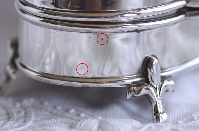 ![]() 脚の付け根に小さな凹み(黒く見えるのは映り込み)。  |