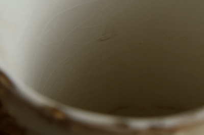 ★A&C16026 菫と勿忘草 リボン飾りのジャグ W15,D10.5,H16.5cm / 送料:Aランク 【送料ページはこちら】 ◆ご注文方法はこちら◆ 時代を経た空気を感じる、アンティークの良い風合いの陶器ジャグ。淡いクリーム色を背景に、リボン飾りの花綱に、スミレとワスレナグサを描いた華やかで愛らしい品。ハンドルや口縁の金彩の、掠れた味わいも好ましく、釉薬全体に貫入の見られる柔らかな質感の陶肌も、紫やブルーの可憐な小花の、古いプリントによく似合います。窯印からイギリスのS.FIELDING & Co.による、1910年代頃の品。 容量は上部のアカンサス模様の部分で420mlほど。底に1箇所欠けが見られますが目立ちません。内部の底近くに薄いシミが見られます。 陶器のジャグやクリーマーをご紹介しています。ページ下部のリンクからご覧ください。 |