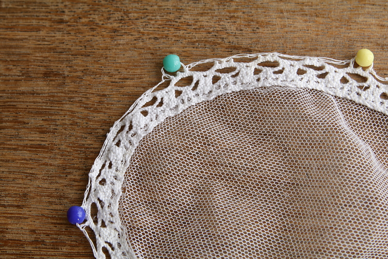 ![]() A&C16030-E:20×15cm(ネットの部分16×12.5cm) / ¥1,700.-〔税込み・送料別〕 繕い跡が1箇所、レースに穴が1箇所見られます。 |