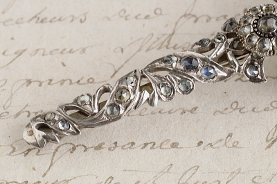 ★A&C16053 ローズカットストーン シルバーターバンピン W37,H95mm(24g) / ¥85,000.-〔税込み〕 天然石(ジルコンかクオーツ) / シルバー 〔品質保証書付き〕 送料:宅配便送料無料(3万円以上) ◆ご注文方法はこちら◆ 銀のレースが細密に切り抜かれ、ローズカットストーンがいっぱいに留められた豪奢なブローチ。この独特な形状は、ターバンに飾るためのジュエリーで、こちらは19世紀のインドで造られた品だと言われています。 丹念な手仕事で造られた、タガネやノコギリの痕跡が感じられる彫金の魅力的なレースに散りばめられた、ローズカットが施された宝石たちは、無色透明といっても、金色がかったものもあれば、青みがかった輝きの石も多く、一石一石が自由に輝く様は、19世紀初期のダイヤモンドジュエリーさながらにプリミティブな美しさを見せてくれます。 個性的なシルエットとディティールにどこか荒々しささえ感じる全長10センチの迫力あるボリュームは、ジャケットやコートの襟元に、男女問わず力強いワンポイントとして身に着けてほしい、話の種にもなる、他ではなかなか見掛けないユニークなブローチです。 ひとつ書き添えておきたいのは、ターバンピンとして使う場合はひょっとするとご紹介写真とは上下逆だったのかもしれません。異文化とは、簡単には解らないから、知っていく面白さがあるのですね。イギリスで購入。宝石のファセットに僅かなスレなど見られますが、肉眼で気になるようなものはなく、しっかりした、たいへんにきれいな状態です。 留められている宝石は、ガラスでなく天然石だと判明しており、天然ジルコン、もしくは、天然クオーツと推測されます。別途有償となりますが、宝石については、ご希望で専門機関の鑑別書を取得することも可能です。刻印などはありませんが、テスト済みのシルバー製。落下防止にシリコンストッパーをお付けします。 存在感のあるピンブローチなどをご紹介しています。ページ下部のリンクからご覧ください。 |