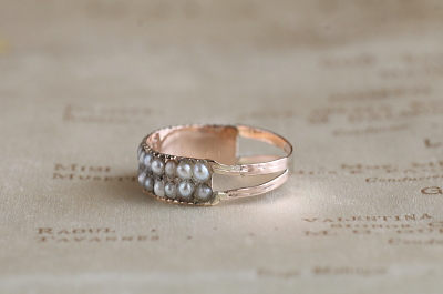 ★A&C16060 ジョージアン シードパールダブルライン ハーフエタニティーリング サイズ12.5号(1.1g) / sold 本真珠 / K8ゴールド 〔品質保証書付き〕 送料:宅配便送料無料(3万円以上) ◆ご注文方法はこちら◆ 直径2ミリに満たないささやかな輝きに古色の滲むシードパールを2列に30粒、ジョージアンのパールリングは一列でもかなり希少ですが、こちらは2重に並べられた大変珍しいハーフエタニティーの意匠です。 真珠養殖が始まる以前の、現代とは比べ物にならないほど真珠が希少だった時代の少しずついびつな天然真珠を並べて、淡く蒼みがかったものや、桃色のツヤを見せるものなど、かすかな彩と慎ましい輝きが、この時代の作品でしか味わえない、このうえなく贅沢なひと品です。 小さな粒を2つにカットして留めるハーフパールは、アンティークならではの精巧な技工で、やや赤みを感じる細身のゴールドシャンクにセットされ、フェイスの裏には流麗な飾り文字のイニシャルが刻まれた、繊細で丁寧な造りはジョージアンアンティークならでは。ホールマークはありませんが、19世紀初めの英国で愛された真珠の指輪です。 特に目立つダメージの見られない、しっかりした状態です。サイズ直しは有償にて承ります。お気軽にご相談ください。写真のアンティークケースは付属しません。 パールとダイヤやルビーなど、コンビネーションリングをご紹介しています。ページ下部のリンクからご覧ください。 |