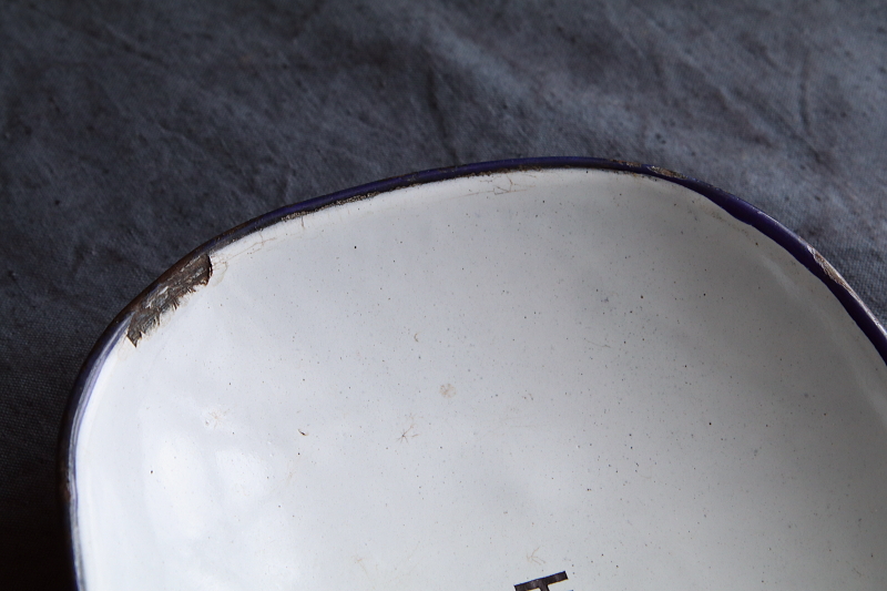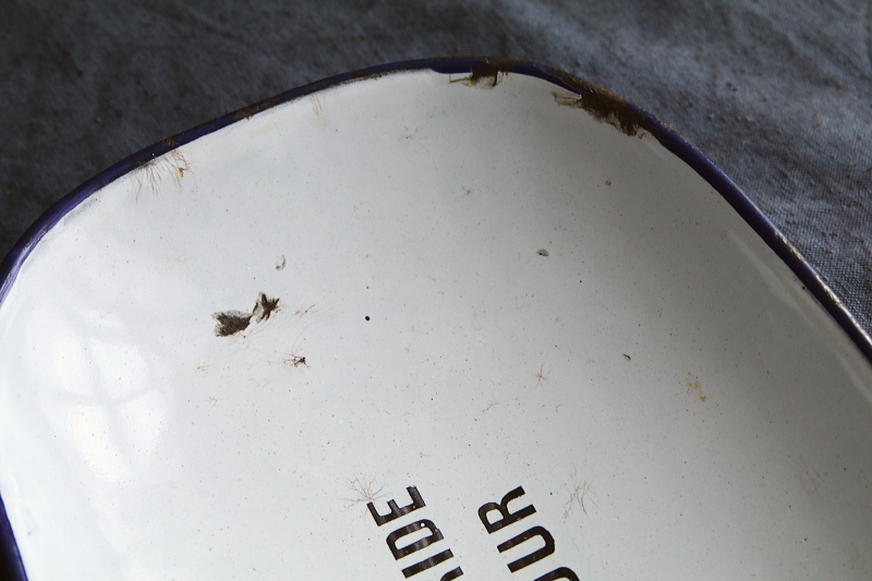 ★A&C16063 HOMEPRIDE アドバタイジングスケール ボディ:W17.5,D14.2,H24cm 上皿:W26.7,D19.5,H4cm / ¥65,000.-〔税込み〕 送料:宅配便送料無料(3万円以上) ◆ご注文方法はこちら◆ 今もイギリスで可愛いマスコット、フレッド君でおなじみの小麦粉メーカー、ホームプライド社のアドバタイジングのキッチンスケールです。小麦粉を量りやすそうな、琺瑯皿面の「HOMEPRIDE FLOUR」のロゴにも特別感が充分です。1930年代ごろの品で、そもそも数の少ないアドバタイジング。スケールと上皿どちらも残っているのは希少で、ホームプライドのスケールを見つけたのは、もう10年振りくらい?、いやもっと昔かも知れません。スケールの製造は、結び目のトレードマークがおなじみのSALTER社で、"FAMILY SCALE"の名前通り、家庭用のしっかりした造りはさすがで、今でも機械部分もしっかりしていて、針の動きもスムーズで、ポンド・オンス目盛りですが、だいたい正しく量れます。 長年働いてきた証でしょう、所々に見られるペイントの剥がれから覗く鉄味も好ましく、古みを感じさせつつ目盛りやロゴがしっかり残っている文字盤も魅力的。「HOMEPRIDE FLOUR」の黒い文字が目を惹く白い表側、ネイビーの裏側含めて、数カ所見られる程度で、琺瑯欠けが少ないのも嬉しいところです。針の動きもスムーズでポンド、オンス目盛りですが、機械部分もしっかりしていて、だいたい正しく量れます。 フレッドくんの絵柄のエプロンや、めずらしいスタイルの秤をご紹介しています。ページ下部のリンクからご覧ください。 |