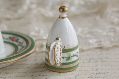 ★A&C16066 ハンドペイント キャンドルスナッファー Victorian W8.6,H6.5cm / ¥19,600.-〔税込み・送料別〕 送料:Aランク 【送料ページはこちら】 ◆ご注文方法はこちら◆ ボーンチャイナの白い肌に、グリーンのボーダーやピンクの薔薇が可愛らしいキャンドルスナッファー。ハンドペイントされた可憐な花の、香りに誘われた蝶が摘みになっており、ちょっとイモムシから成長しきれていないような、とぼけたお顔も可愛らしいです。19世紀、ヴィクトリア時代のイギリス製で、100年以上の時間を経てもなおきれいな状態で、おそらく未使用だと思います。 金彩にスレが幾らか見られますが、それ以外に目立つダメージの見られない、きれいな状態です。 ヴィクトリアンのハサミ型のキャンドルスナッファーなどご紹介しています。ページ下部のリンクからご覧ください。 |