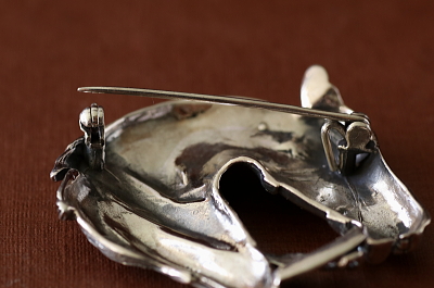 ★A&C16071 ホースヘッド シルバーブローチ 40×43mm(13.2g) / マーカサイト / 925シルバー 送料:宅配便送料無料(3万円以上) ◆ご注文方法はこちら◆ スターリングシルバーで表現されたホースヘッドのシルバーブローチ。流れるタテガミの表現が魅力的で、マーカサイトで目や馬具に輝きを持たせた、走る姿を彷彿とさせる生き生きとした姿です。しっかりとした重みはジャケットやコートに似合いそう。特に目立つダメージの見られない、きれいなしっかりした状態です。20世紀後期、ヨーロッパのヴィンテージです。 ホースヘッドやホースフットモチーフのアンティークをご紹介しています。ページ下部のリンクからご覧ください。 |
