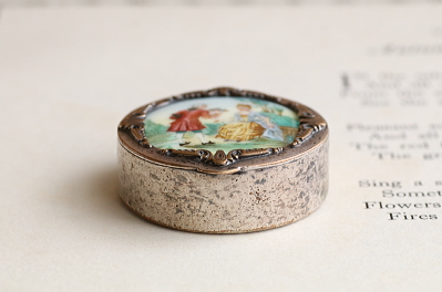★A&C16084 ロココのミニアチュール パウダーケース W4.2,D4.5,H1.5cm / ¥18,600.-〔税込み・送料別〕 送料:Aランク 【送料ページはこちら】 ◆ご注文方法はこちら◆ シルバープレートのパウダーケースの蓋には、ポーセリンのミニアチュールが飾られて可愛らしい。滲むような柔らかいタッチで、ロココの時代のロマンティックなワンシーンを手描きします。蓋を開くと小さいサイズに、丁寧に面取りされたミラーが現れる、しっかりとした重みも心地よいひと品です。ミニアチュールの縁飾りはシルバープレートが摩滅して、経年の味わいも好ましいボディに、小さくともアンティークミラーの風合や、あたたかな色使いなど、魅力的なひと品です。1900年頃のフランスから。 ポーセリンにごく小さなヒビが1箇所見られますが、よく見ないとわからない程度で、あまり気にならないと思います。蓋や底のシルバープレートに摩滅が少々見られますが、経年のアンティークの風合として愉しめるものです。ミラーはきれいで、全体にしっかりした状態です。 パウダーケースや香水瓶をご紹介しています。ページ下部のリンクからご覧ください。 |