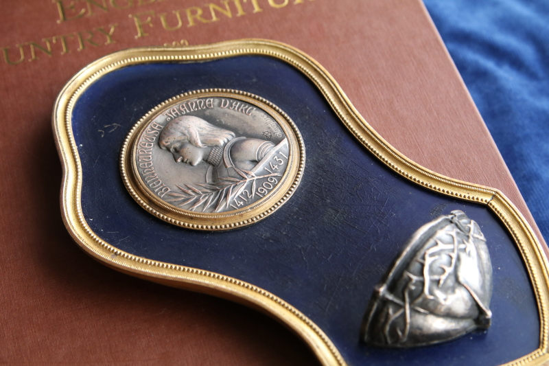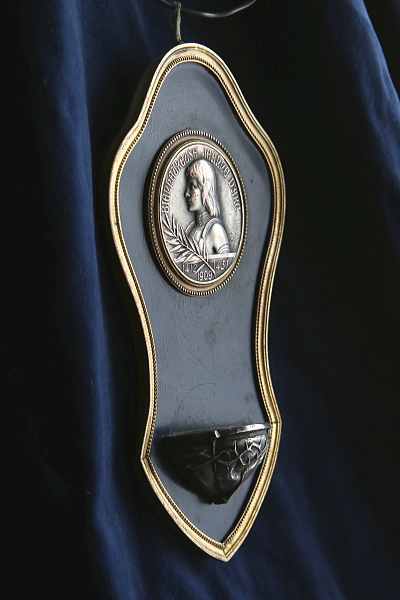 ★A&C16107 ジャンヌダルク 列福のメダルの聖水盤 W11,DD3,H19cm / ¥17,500.-〔税込み・送料別〕 送料:Aランク 【送料ページはこちら】 ◆ご注文方法はこちら◆ 甲冑を身につけた、聖ジャンヌの凛々しい横顔。見つめる視線の先に、何が見えているのか、悲劇を知る者として気にかかります。メダルの生没年の下に1909と有るので、1909年の列福さを記念した聖水盤のよう。メダルを飾る木製ベースの、深い藍色の塗装と、金色のメタルの縁取りとのコントラストが美しい。古い塗装にはヒビ割れが見られる、経年の表情も好ましいひと品。裏板はネイビーの半透明の素材で、見えないところも美しく仕上げられています。1909年の列福から1920の列聖までの品と思われます。フランスから。 他にもジャンヌダルクのアンティークや、聖水盤をご紹介しています。ページ下部のリンクからご覧ください。 |