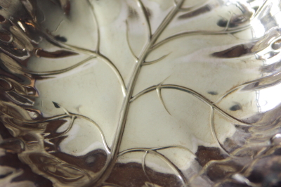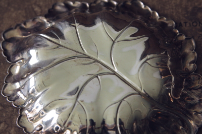 ★A&C13600 木の葉のピントレイ W12.5,D14.5,H2cm / 送料:Aランク 【送料ページはこちら】 ◆ご注文方法はこちら◆ 縁に少々見られる黒ずみも、黄変を始める葉っぱの表情を思わせます。このカタチなら葡萄の仲間かと思うのですが、葉脈なども生き生きと再現され、これからの表情の変化も楽しみなシルバープレートのピントレイ。アクセサリーや鍵の置き場所として、しっかりとした厚みと重みのある、風情あるおすすめの小皿です。20世紀初めごろの英国から。 表面のキズが幾らか見られますが、シルバープレートの摩滅などは見られません。 華やかなデザインのピントレイやキャンディーディッシュをご紹介しています。ページの下の方からご覧下さい。 |