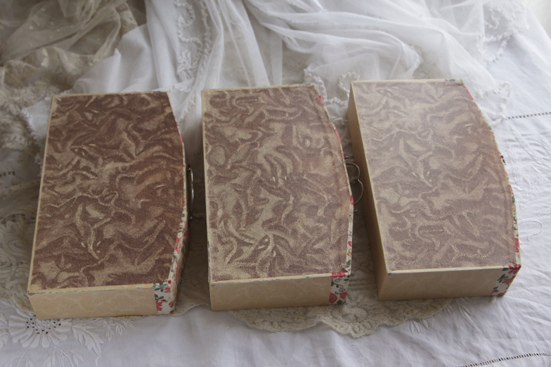 ★A&C13706 カルトナージュの小引き出し 花に小鳥 W26.5,H14.5,H19cm / 送料:Aランク 【送料ページはこちら】 ◆ご注文方法はこちら◆ 花や実の成る小枝に小鳥が遊ぶ、可愛らしいファブリックを使ったカルトナージュの小引き出し。あたたかみのある淡いクリームの地色に、ピンクの小鳥や花、グリーンの葉がバランスよく配色されて可愛らしい。中段の引き出しの動きが少々固いですが、上、下段は滑らかです。木と紙や布で作られた、カルトナージュの引き出しはやはり壊れやすい物で、全体にきれいなしっかりした状態は珍しく、何十年もよくぞきれいに残してくれたと嬉しくなります。1930年代頃のフランスから。 木製の小引き出し等をご紹介しています。ページの下の方からご覧ください。 |