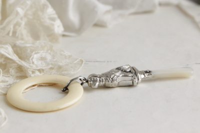 ★A&C13933 レトリバーのシルバーベビーラトル L14cm(14.6g) / 送料:Aランク 【送料ページはこちら】 ◆ご注文方法はこちら◆ お行儀よくおすわりする、レトリバーらしき姿が可愛らしい、スターリングシルバーのベビーラトル。マザーオブパールのハンドルと、樹脂のリングがついた、贅沢な仕様のひと品。スターリングシルバーのラトルには、凹みも見られずきれいな状態で、シルバーの輝きも美しく、毛艶の良い名犬の風格漂う造形の良さが魅力的。1960年のイギリスは、チェスター製。壁に下げて飾っても可愛らしく、オーナメントとして、いろいろな場所で活躍してくれそうです。 表面の小キズ以外に特に目立つダメージの見られない、きれいなしっかりした状態です。 ベビーラトルや、フードプッシャーなど、赤ちゃんのための食器やアクセサリーをご紹介しています。ページの下の方からご覧ください。 |