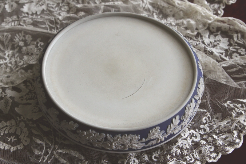 ★A&C13940 ジャスパーウェアのチーズドーム W23.8,H21cm / sold 送料:宅配便送料無料(3万円以上) ◆ご注文方法はこちら◆ 深く重厚なブルーの肌に、天上の光景が浮かび上がる、ジャスパーウェアのチーズドーム。無施釉のストーンウェアならではの、発掘された神像を思わせる、乾いた質感のレリーフによる表現が美しい。受け皿にはエイコーンをたわわに実らせる、オークの枝がぐるりと取り巻き、チーズを守るための神聖な結界のようにも思えます。ウエッジウッド製ではなく、窯印はありませんが、スタッフォードの他の窯による、19世紀、ヴィクトリアンのジャスパーウェアです。ドームと受け皿の発色に若干差があり、オリジナルの組み合わせではないかもしれませんが、特に違和感なくなじんでいます。百年あまりを経てなお、力強さと風格を今に保つ贅沢な器は、テーブル上でも主役の存在感を発揮してくれますよ。受け皿にうっすら経年の色づきが見られますが、匂いなどはなく、比較的取り回しの良いサイズ感も嬉しいです。 受け皿の平らな部分の直径は20.5cm、ドームの内寸は、W18.5×H10cm。受け皿に経年の色づきが見られる以外に、特に目立つダメージはみられません。 ジャスパーウェアの小物をご紹介しています。ページの下の方からご覧ください。 |