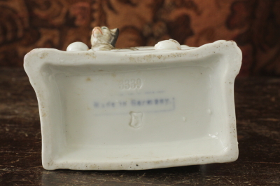 ★A&C13947 猫たちのヴィクトリアンフェアリングス "Five O'clock Tea" W9.3,D5.3,H9.8cm / 送料:宅配便送料無料(3万円以上) ◆ご注文方法はこちら◆ 5匹の猫が、5時のお茶の時間を愉む、愛らしいフィギュリンをご紹介。 ヴィクトリア時代に人気のあった、フェアリングスと呼ばれる小さな磁器の置物は、コレクターズアイテムとして現代でも人気です。 "FIVE O'CLOCK TEA"とありますが、午後のお茶を愉しむ猫たちの、お上品なすまし顔が可愛らしいタイトルは、フェアリングスの中でも特に人気のある希少品です。後の時代にもにたようなモチーフで何度か造られましたが、19世紀オリジナルのこのモデルは見ることがありません。状態もかなり良好です。小さな磁器の猫たちの、顔立ちの良さや表情の愛らしさは、猫好きが作ったに違いないと思わせる見事な物で、小さなサイズにアンティークの風格を感じさせる、美しい造形です。後ろから見ても、上から見下ろしても、猫の毛並みを再現する筆のタッチに惚れ惚れして、いつまでも愛でて見飽きることはありません。 ティーポットのスパウトに欠けがあるのが残念ですが、それ以外にはダメージが見られず、これだけきれいな状態も珍しい。19世紀のドイツで、英国向けに作られた、ポーセリンのフェアリングスです。 他にもフェアリングスやフィギュリンなどをご紹介しています。ページの下の方からご覧ください。 |