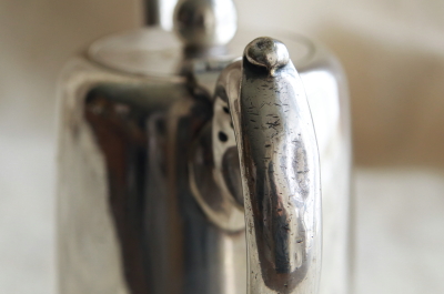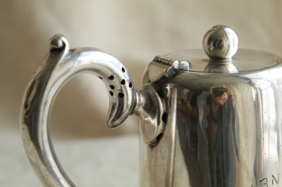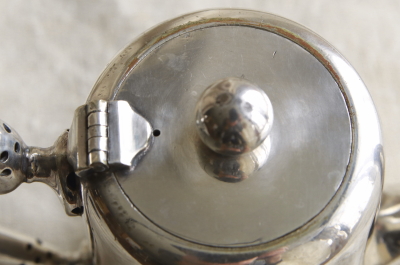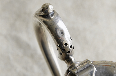 ★A&C15620 FURNESS LINE コーヒーポット Walker & HAll W18.5,D8.8,H14.5cm / sold 送料:Aランク 【送料ページはこちら】 ◆ご注文方法はこちら◆ 衒いのない道具然としたシルエットに用の美を感じる、シルバープレートのコーヒーポットは、英国の鉄道、FURNESS LINEの食堂車で使われたもの。FURNESS LINEは、1846から1857年にかけて段階的に開通し、ロンドン・ミッドランド&スコティッ鉄道(LMS)傘下からブリティッシュレイルウェイズを経て、Barrow-in-FurnessとLancasterの間で現在も運行を続ける、歴史あるローカル線です。シルバープレート表面のキズを見るに、長年業務で使われてきたことが分かりますが、胴に凹みなど見られない、タフな作りが頼もしい。メーカーは英国の名店Walker & Hallで、これは流石の仕事と感心させられます。ハンドルの親指を置く部分と、蓋のつまみが当たる部分に凹みが、蓋の近くにシルバープレート摩滅が見られますが、それ以外に目立つ凹みや摩滅は見られず、厚いシルバープレートや丈夫な作り、なにより美しいフォルムが魅力的なコーヒーポットです。容量は満水で550ml程。水切れよし。1935年頃のイギリス製。 長年、擦り続けた為でしょう、内部底面から高さ4センチほどにかけてメッキが摩滅しています。内部はクリーニング済みです。 公共鉄道の歴史は、イギリスで1825年、世界初の蒸気機関車を使った公共鉄道、ストックトン&ダーリントン鉄道に始まり、そうした100を超える地方の私鉄会社が吸収合併を繰り返し、1923年、グレートウェスタン鉄道(GWR)、ロンドン&ノースイースタン鉄道(LNER)、ロンドン・ミッドランド&スコティッ鉄道(LMS)、サザン鉄道(SR)の4社、ビッグフォーにグループ化されました。1948年、ビッグフォーの各社は国有化され、ブリティッシュレールウェイズ(BR)が誕生します。 レストランウェアの食器やカトラリーをご紹介しています。ページ下部のリンクからご覧ください。 |