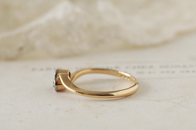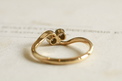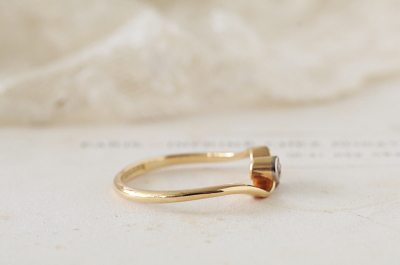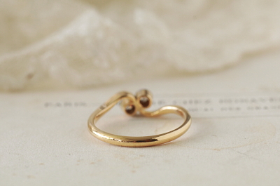 ★A&C15626 オールドカットダイヤモンド トワ・エ・モアリング サイズ13.5号(2.4g) / sold 天然ダイヤモンド / K18ゴールド 〔品質保証書付き〕 送料:宅配便送料無料(3万円以上) ◆ご注文方法はこちら◆ まだブリリアントカットができる前の時代、ダイヤモンドのカットもどこか整いきらない、オールドカットの小粒のダイヤが2石、柔らかく伸びた金の蔓の先に寄り添うように留められています。片方は少し暗めの輝き、もう片方は淡いシャンパンカラーで、どちらもアンティークらしい魅力を持ったダイヤです。シャンクのイエローゴールドはK18の豊かな色みで、シンプルなデザインの慎ましいボリュームの中にも輝きが引き立つ、20世紀初期のイギリス製。仲睦まじく宝石が寄り添う姿から、「トワ・エ・モア」と呼ばれる、贈り物にも最適な、可憐ひと品です。 ベゼルに埋め込むようにダイヤがセットされていて、引っ掛かりの心配も少なく、気負わずに身に着けられるのもポイントです。 特に目立つダメージの見られない、きれいなしっかりした状態です。 サイズ直しは有償にて承ります。お気軽にご相談ください。写真のアンティークケースは付属しません。 様々なデザインのオールドカットダイヤモンドリングをご紹介しています。ページ下部のリンクからご覧ください。 |