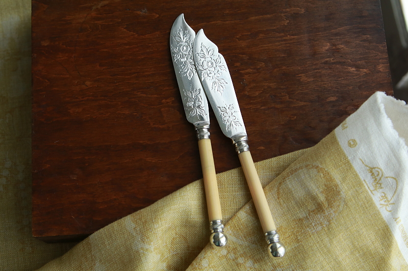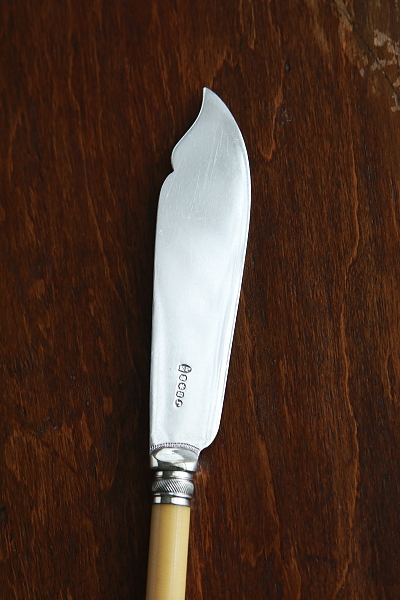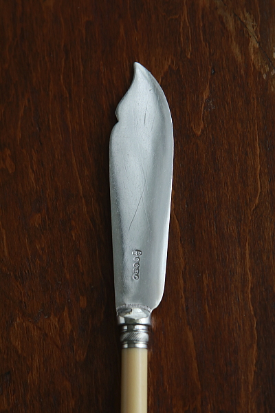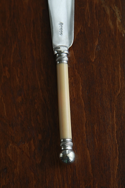 ★A&C15642 花の彫刻 アイボリーハンドルバターナイフ JOHN SANDERSON & SON A&C15642-A,B共:L17.5cm(33g) / 各¥9,300.-〔税込み・送料別〕 送料:Aランク 【送料ページはこちら】 定形外郵便対応【ご注文時にお申し付けください】 ◆ご注文方法はこちら◆ 花模様がハンドエングレービングで描かれた、シルバープレートのブレードと、シンプルさ故に、象牙の素材感が際立つアイボリーハンドルの組み合わせ。豪華な素材や手の込んだな装飾、それでいて道具としての使い勝手を感じさせるバランスの良さが好ましい。しっかりしたサイズ感は、ティーナイフとして使いでがありそうですし、何より手にすることに喜びを感じられます。イギリスの工房、JOHN SANDERSON & SONによる、19世紀のヴィクトリアンアンティーク。 シルバープレートのブレード表面にキズや、刃にキズがいくらか、エンドの玉のシルバープレートに摩耗でうっすら金色に透ける部分がありますが、特に目立つダメージはみられず、全体にきれいなしっかりした状態と言えます。 ブレードとハンドルをニカワで接着していると思われます。湯水に長時間浸けたり煮沸すると、ニカワが溶けますので注意して下さい。食洗機不可。 アイボリーハンドルのカトラリーや、バターナイフをご紹介しています。ページ下部のリンクからご覧ください。 |