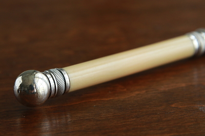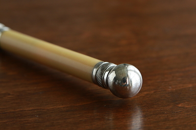 ![]() エンドの玉のシルバープレートに摩耗でうっすら金色にすける部分があります。 |