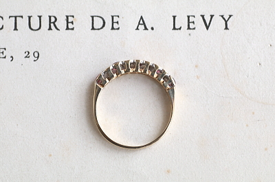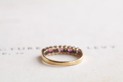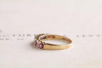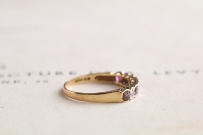 ★A&C15647 ルビー&ダイヤバンドリング LONDON 1986 サイズ14.5号(1.7g) / ¥64,000.-〔税込み〕 天然ルビー / 天然ダイヤモンド / K9ゴールド 〔品質保証書付き〕 送料:宅配便送料無料(3万円以上) ◆ご注文方法はこちら◆ ルビーとダイヤモンドが交互に並ぶ、可憐な輝きのバンドリング。5石のルビーはボリューム感もあり、パープリッシュピンクの発色も甘やかで、クリアなダイヤモンドとのコントラストも鮮やかに指を飾ります。女性的な繊細さと、素材の良さを感じさせる、1986年のロンドンメイド。特に目立つダメージの見られない、きれいなしっかりした状態です。 写真のアンティークケースは付属しません。 アンティークやヴィンテージのルビーリングをご紹介しています。ページ下部のリンクからご覧ください。 |