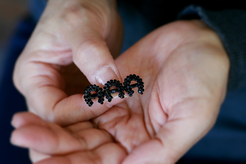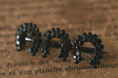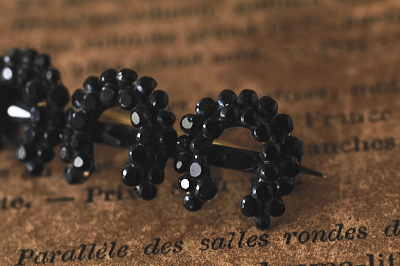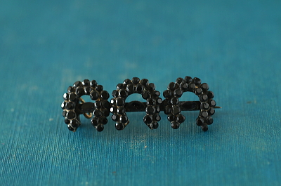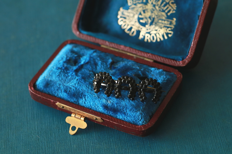 ★A&C15659 フレンチジェット ホースシューバーブローチ Victorian 36×13mm(3.1g) / ガラス / メタル / 真鍮(ピン) 送料:Aランク 【送料ページはこちら】 定形外郵便対応【ご注文時にお申し付けください】 ◆ご注文方法はこちら◆ 黒い馬蹄形が3つ並んだバーブローチ。メタルのベースに一つ一つフレンチジェットの粒をとめる、漆黒の光沢が瞬く様子が厳かです。ジェットは、1億年以上も昔の流木の化石ですが、フレンチジェットは、フランスやチェコで作られた黒いガラスで、イギリスではこう呼ばれました。当時は漆黒のガラスは作るのが難しく、それ故に黒いジュエリーの素材として、ヴィクトリア期のイギリスで好まれました。黒い輝きに幸運のシンボルに込められた想いが感じられそうな、19世紀のイギリスの品。 様々な素材の黒いジュエリーをご紹介しています。ページ下部のリンクからご覧ください。 |