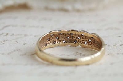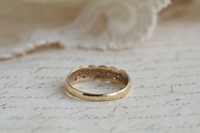 ★A&C15676 ダイヤモンド ロープパネルリング サイズ14号(1.9g) / 天然ダイヤモンド / K9ゴールド 送料:宅配便送料無料(3万円以上) ◆ご注文方法はこちら◆ より合わせたロープのようなデザインのパネルフェイスに、15石のダイヤモンドを敷き詰めたリング。ミル打ちされたホワイトゴールドのフェイスに照らされて、1粒1粒は小さくとも、メレダイヤの光が集まり明るく健気に瞬く様子が愛らしい。1990年のバーミンガム製。オーソドックスでありながらも、上品で可愛らしいブリティッシュヴィンテージリングです。 特に目立つダメージの見られないきれいなしっかりした状態です。サイズ直しは有償にて承ります。お気軽にご相談ください。写真のアンティークケースは付属しません。 様々なデザインのヴィンテージダイヤモンドリングをご紹介しています。ページ下部のリンクからご覧ください。 |