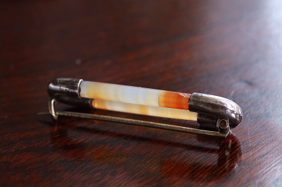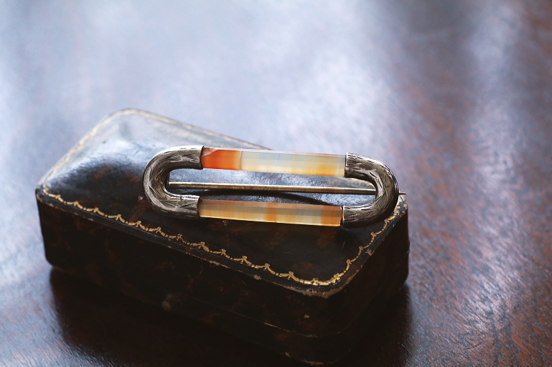 ★A&C15692 ヴィクトリアンアゲート&シルバー スコティッシュブローチ 50×15mm(4.7g) / ¥24,000.-〔税込み・送料別〕 天然アゲート / シルバー 送料:Aランク 【送料ページはこちら】 ◆ご注文方法はこちら◆ 透き通る石の中を、オレンジのグラデーションが浮かび上がる。スコットランド名産の縞メノウを二本、八角柱に削り出し、シルバーのパーツで繋ぐシンプルなシルエット。シルバーパーツには素朴な松葉のような模様が彫られ、スコットランド伝統のデザインや輝きが、スタイリッシュに感じられるブローチです。19世紀のスコットランドから。 落下防止にシリコンストッパーをお付けします。アゲートとシルバーパーツの継ぎ目に小さな欠けが見られます。それ以外は全体にきれいなしっかりした状態です。刻印などは有りませんがテスト済みのシルバー製。写真のアンティークケースは付属しません。 自然石の質感と、ユニークなデザインが魅力のアゲートブローチをご紹介しています。ページ下部のリンクからご覧ください。 |