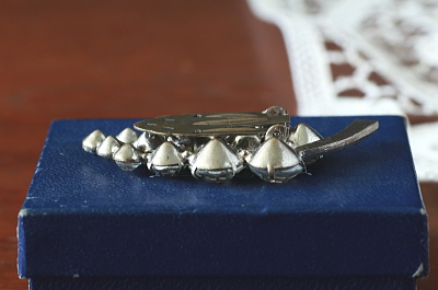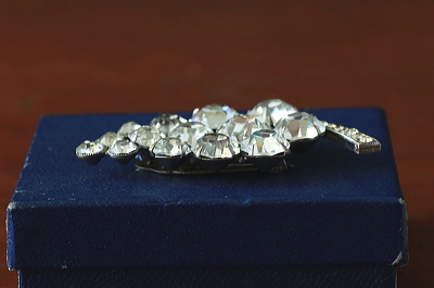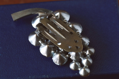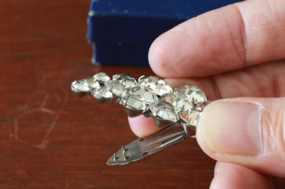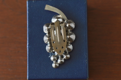 ★A&C15701 ラインストーンの葡萄ドレスクリップ W28×53.5mm(12g) / sold ガラス / メタル 送料:Aランク 【送料ページはこちら】 定形外郵便対応【ご注文時にお申し付けください】 ◆ご注文方法はこちら◆ クリアで明るい煌めきが目を惹く、ラインストーンを集めたブローチ。古来様々な素材、デザインで表現されてきた葡萄のアクセサリーを、シンプルモダンなデザインでドレスクリップに落とし込んでいます。おおぶりでしっかりとした持ち重りも、ミッドセンチュリーの華やかな時代を思い起こさせます。20世紀中期のイギリス製。 特に目立つダメージの見られない、きれいなしっかりした状態です。クリップが中央にあるので、留めたところから、葡萄の上部が上に出ます。写真のケースは付属しません。 様々なデザインのコスチュームジュエリーをご紹介しています。ページ下部のリンクからご覧ください。 |