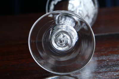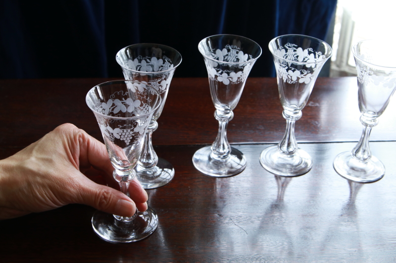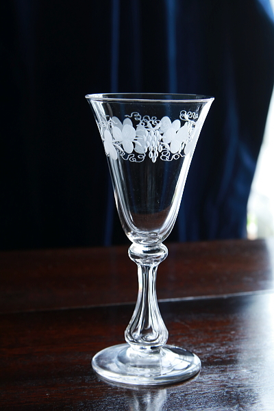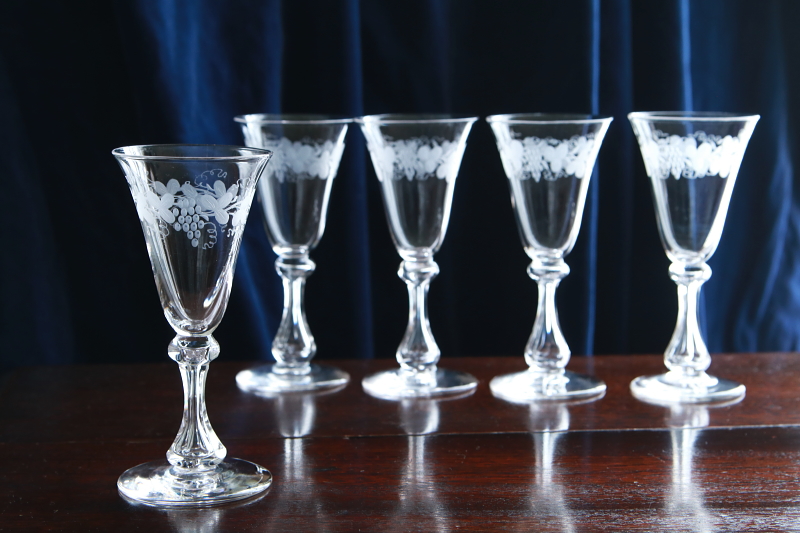★A&C15702 葡萄のエングレーヴィング クリスタルシェリーグラス A&C15702-A~E共:(A,B,C sold) W5.8~6,H13~13.2cm / 各¥5,500.-〔税込み・送料別〕 送料:Aランク 【送料ページはこちら】 ◆ご注文方法はこちら◆ スマートなフォルムにも個性を感じさせる、クリスタルグラスのステムグラス。ボウルの上部にはエングレーヴィングで、葡萄の絵柄を彫り上げて華やかです。中空に整形したステムは、六方を面取りした、シャープな輝きが美しい。葡萄柄に容量がすり切りで70ml程と、シェリーグラスとして作られたものでしょう。食前酒や少量のワイン、カクテルや冷酒など、使い勝手の良いサイズとスタイルが重宝なひと品は、1900年頃の品と思われます。イギリスで購入。 何れもガラス表面にキズが幾らか見られますが、使用上気にならない程度だと思います。全体にきれいなしっかりした状態です。 様々な技法で模様を描かれたステムグラスをご紹介しています。ページ下部のリンクからご覧ください。 |