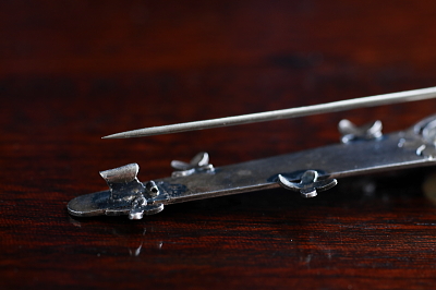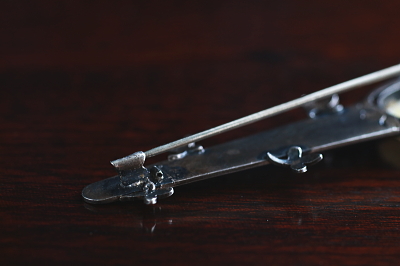 ★A&C15703 シェル飾りの薔薇 シルバーブローチ W30×H80cm(11.7g) / ¥37,000.-〔税込み〕 天然シェル /カットスチール/ 800シルバー 送料:宅配便送料無料(3万円以上) ◆ご注文方法はこちら◆ ボリュームのある広い銀板を使って、ユニークな造形に仕立てられた、大ぶりなブローチ。シルバーのフラットで無機的な輝きと、白く膨らんだ貝の艶めかしいツヤのコントラストに興味をそそられる。小さな生花のブーケを胸元に飾るためのブローチが流行した時代もあったけれど、アールデコの時代の、この少し幾何学的にデフォルメされた薔薇も、差し詰めそういったイメージが時代に呼応したものと見受けます。銀板の外側に切り残された、飛び出した葉っぱが少し茶目っ気をプラスしているようで、ラグジュアリーな中に可愛らしさが感じられる、ちょっと捉えどころのない不思議な魅力です。南フランスで見つけたものですが、800シルバーを示す【800】の刻印があり、ドイツの物かもしれません。1920~30年代の品と考えられます。 特に目立つダメージの見られない、きれいな状態です。 写真のケースは付属しません。 他にもシルバージュエリーをご紹介しています。ページ下部のリンクからご覧ください。 |