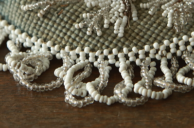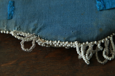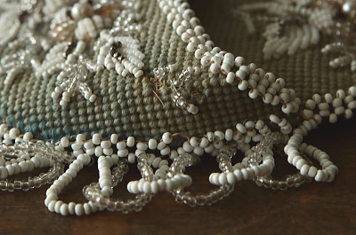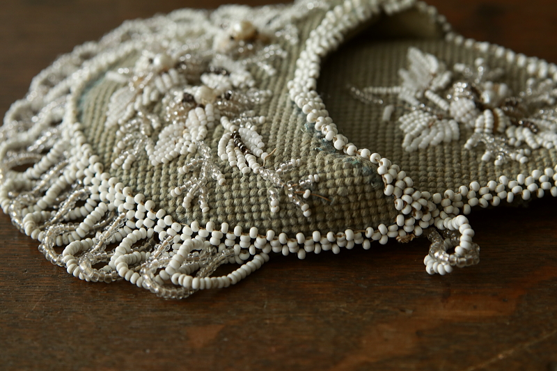 ★A&C15709 ヴィクトリアンビーズワーク ウォッチポケット A&C15709-A: W11.3×H16cm(フリンジ含まず) / A&C15709-B:(フリンジ欠損) W11.3×H16cm(フリンジ含まず) / ¥12,600.-〔税込み・送料別〕 送料:Aランク 【送料ページはこちら】 定形外郵便対応【ご注文時にお申し付けください】 ◆ご注文方法はこちら◆ 年月の中で程よく色褪せた、シックなモスグリーンのプチポワンを背景に、白や透明のガラスビーズで花を描く、ビーズワークが華やかなウォッチポケット。懐中時計のためのポケットですが、高価な時計のために用意されただけあり、立体的な花模様とガラスの光沢がいかにも贅沢です。縁取りのフリンジも可愛らしく、飾っておくだけでも十分に思えるヴィクトリアンアンティークは、古みと可憐さが同居する、大人の乙女心をそそるひと品。19世紀のイギリスから。 Bに縁取りのフリンジの欠損が見られます。何れも目立たないものの、ビーズの欠落がいくらか見られます。芯地の厚紙に折れ、裏地のシルクに小さな穴がわずかに見られますが強度的にはしっかりしています。裏にリボンが一部残っていますが、ループにはなっていないので、フックなどにはかけるには紐やリボンを縫い付けてください。 他にもウォッチポケットなど、いろいろなビーズワークのアンティークをご紹介しています。ページ下部のリンクからご覧ください。 |