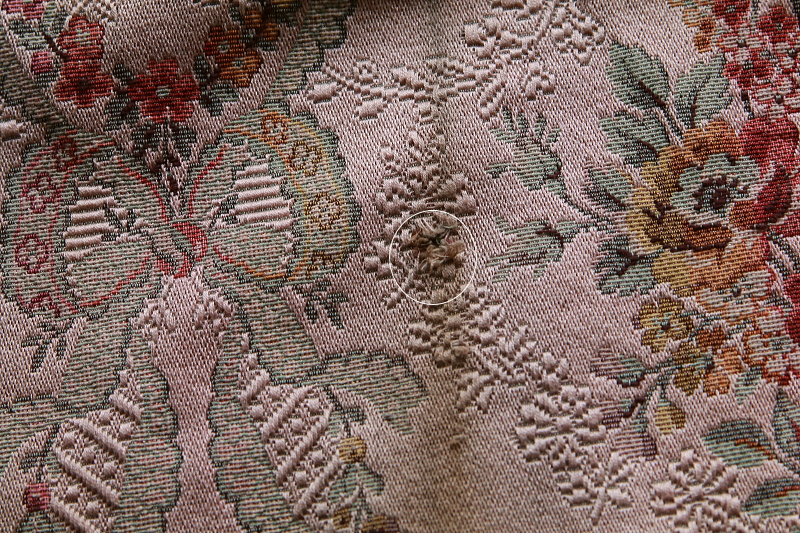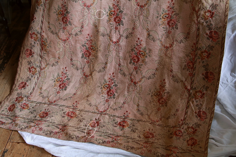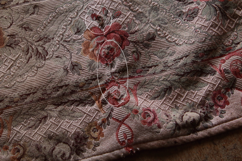 ![]() 丸の位置に小穴や繕い跡。ドレープに筋状に染みが見られます。 |