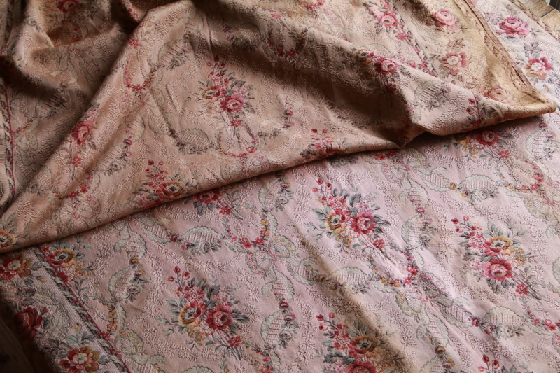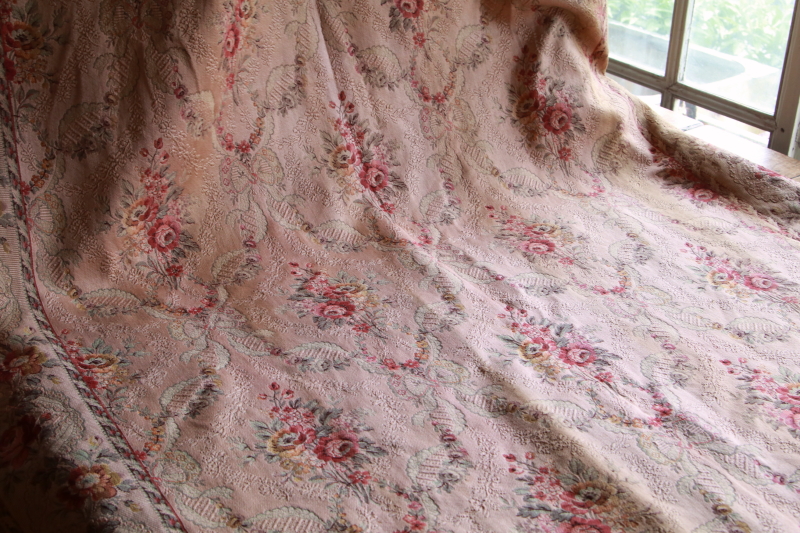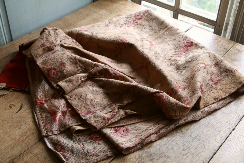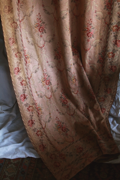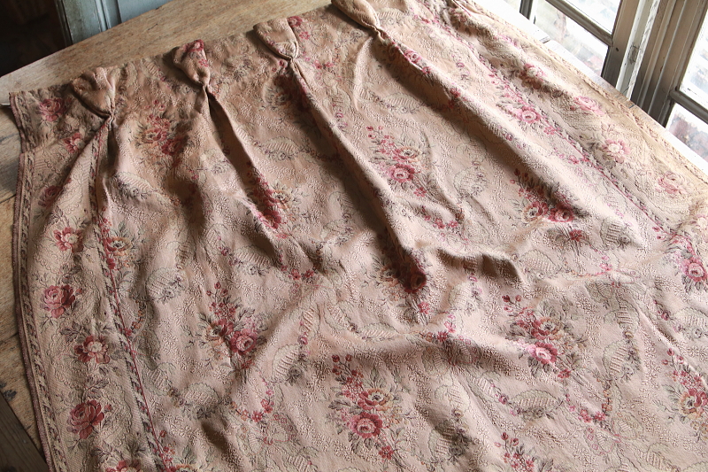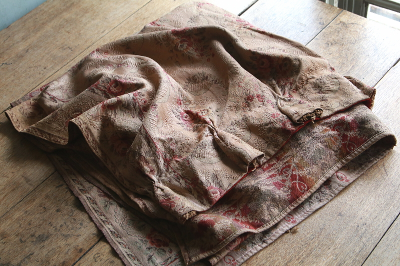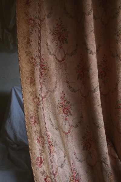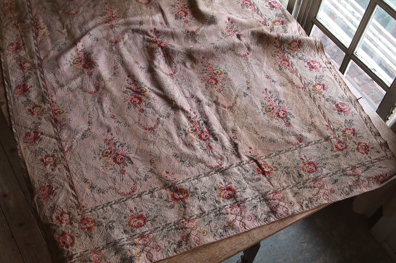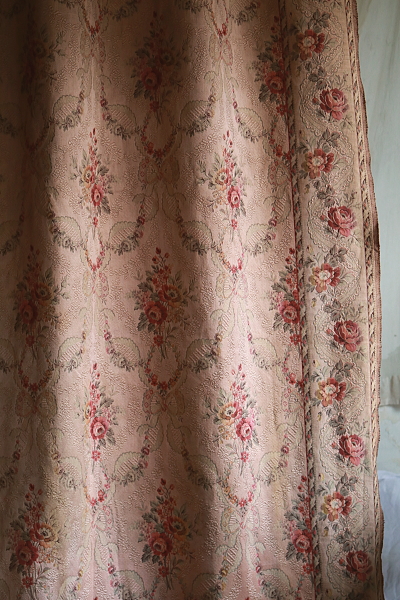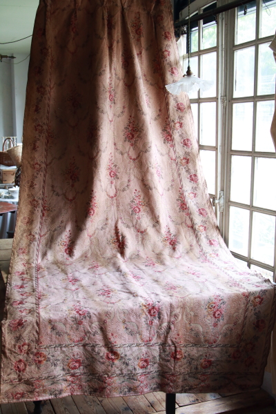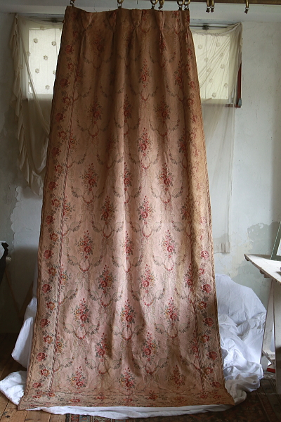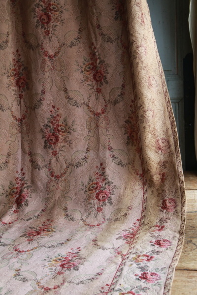 ★A&C15710 薔薇とリボンのゴブランカーテン A&C15710-A: 87~124×282cm / A&C15710-B: 89~122×282cm / 送料:宅配便送料無料(3万円以上) ◆ご注文方法はこちら◆ 時代に渋く色づいた、ニュアンスのある淡いピンクを背景に、薔薇の花やリボンを織り上げた細長いシルエットのカーテン。ウールの色糸を織り上げた、ゴブラン織りならではの重厚な生地感や、立体的で深みのある花色の薔薇の表現、薔薇と交互に浮かび上がる淡い色のリボンなど、見ているだけでも贅沢な気持ちになれるインテリアファブリックです。1900年頃のフランスから、目の詰まった織りにも古みを感じられる、古色も魅力に思える、織り柄の美しいゴブランカーテンです。 当店でクリーニング済み。色褪せや染みが見られますが、広げると分かるものの、カーテンとして吊るした状態ではドレープに紛れてあまり目立ちません。 上部に黄ばみ、下部に退色が有りますが、中間部分は色がきれいに残っています。色みの違いは並べるとわかりますが、全体で見たときにはグラデーションで目立ちません。Bの下部に小穴が見られますが目立たず、それ以外は生地の状態はしっかりしています。 他にもゴブランのカーテンをご紹介しています。ページ下部のリンクからご覧ください。 |