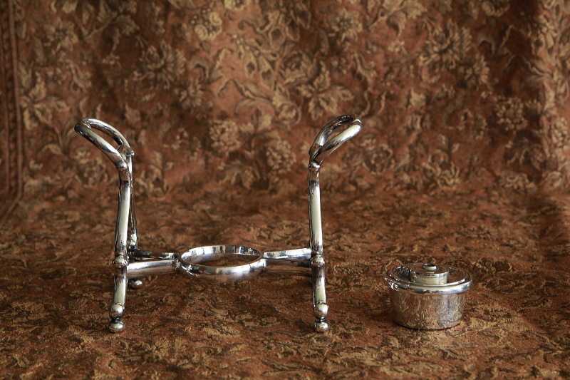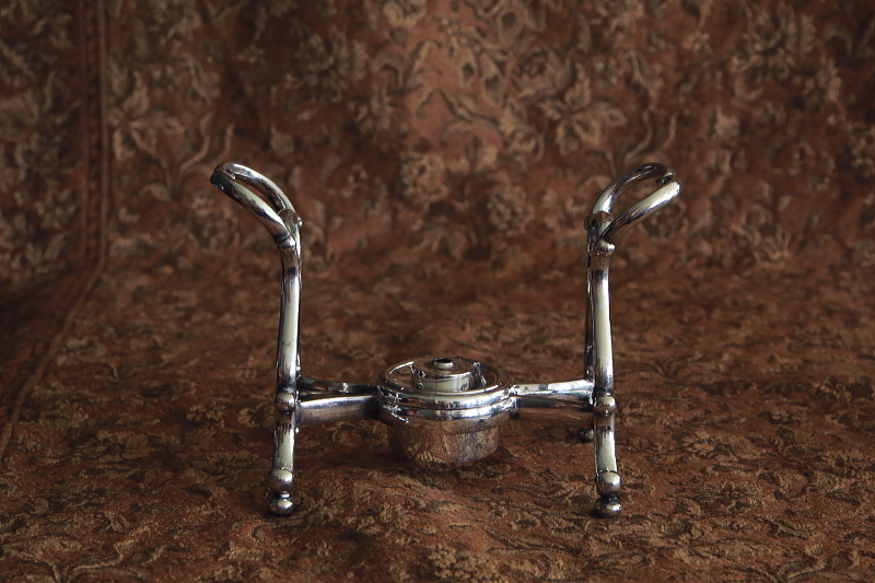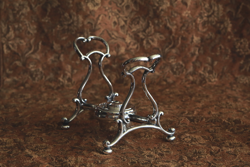 ★A&C15714 薔薇のレリーフのティーケトル&スタンド Philip Ashberry & Sons W20,D22.5,H30.5cm / ケトル:W20,D16,H22cm スタンド:W13.5,D22.5,H15.5cm 送料:宅配便送料無料(3万円以上) ◆ご注文方法はこちら◆ 常に熱いお湯をテーブルに用意する為、アルコールバーナーで保温できるスタンドに据えられた、シルバープレートのティーケトルは、時代がかったスタイルも魅力的なヴィクトリア時代の品。紅茶の国英国の工房、Philip Ashberry & sonsによる、薔薇のレリーフと、精緻な曲線のシルエットが美しいひと品です。100年を超える時間を過ごしてきて、手のよく触れる蓋の近くなど、シルバープレートの摩滅もいくらか見られますが、歴史ある英国茶器が大切に扱われてきたことを偲ばせる、全体にきれいなしっかりした状態も嬉しい。内部はいくらか染みが見られますが、クリーニング済みです。19世紀後期のイギリス製。 容量は胴の一番広い部分までで900ml程。バーナーの蓋は開きますが、芯を入れるネジが固くて外れません。シルバープレートの摩滅が少々見られますが、底の小さな凹み程度で、目立つ凹みなどのダメージは見られず全体にきれいな状態で残っています。ハンドルはの持ち手のジョイント部分が少々ぐらつきますが使用上問題有りません。蓋にわずかに浮きがあります。 シルバープレートのティーセットをご紹介しています。ページ下部のリンクからご覧ください。 |
