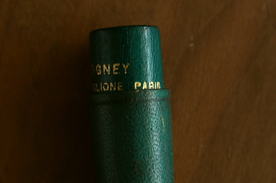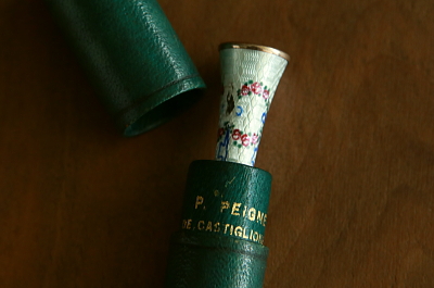 ★A&C15719 ギロッシュエナメル&アイボリー シガレットホルダー "リボンとローズガーランド" ホルダー:W1.3,L12.2cm(8.2g) ケース:W1.7,L12.7cm / 象牙 / エナメル 送料:Aランク 【送料ページはこちら】 ◆ご注文方法はこちら◆ 深く発色の良いグリーンのレザーケースから、象牙の吸口とギロッシュエナメルのホルダーが現れる、華麗なシガレットホルダー。レザーケースに記された住所から、1910年創業のHotel le Lottiのテナントショップで販売されていたものと知ると、なるほど贅沢な作りにも納得です。リボンとローズガーランドが細やかな地模様に浮かび上がる、淑女の為の贅を凝らした工芸品のような喫煙具。コレクションに加えたくなる逸品です。1910年代頃のフランス製。 ケースにホルダーを仕舞うと蓋が少し浮いてしっかり閉まりません。エナメルに小さな欠けが見られますが、あまり目立ちません。象牙の吸い口に染みが残りますが、クリーニング済みです。 贅沢な素材や趣向を凝らした喫煙具をご紹介しています。ページ下部のリンクからご覧ください。 |