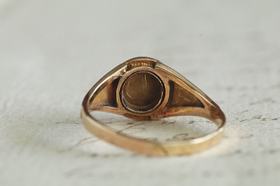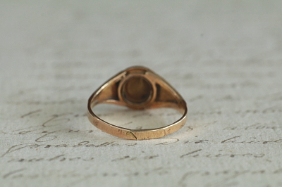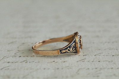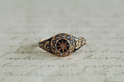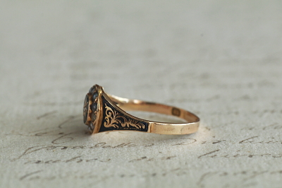 ★A&C15721 ヴィクトリアン エナメルモーニングリング サイズ16号(2.3g) / ¥115,000.-〔税込み〕 天然ダイヤモンド / 天然パール / K15ゴールド / エナメル 〔品質保証書付き〕 送料:宅配便送料無料(3万円以上) ◆ご注文方法はこちら◆ フェイスの中央にセットしたダイヤモンドが、変わらない想いを思わせる。周りをシードパールで取り巻いて、清らかな輝きのエナメルモーニングリング。ゴールドのフェイスやシャンクの、窪んだ部分には黒に近い濃いネイビーのエナメルを施して、レリーフや石を際立たせて、シックなコントラストです。小さなダイヤは素朴なローズカットが柔らかい煌めきで、天然シードパールは色みや巻きの具合にばらつきのある、アンティークにしか見られない趣のある光沢を愉しめます。ホールマークから1872年のバーミンガム製と分かる英国製の指輪は、ヴィクトリア時代に流行した、故人の思い出を身に着ける、ロマンティックなモーニングリングです。 遺髪など思い出の品を収めるスペースがフェイス裏にありますが、ガラスカバーはなくなっています。フェイスやサイドのエナメルにごく小さな欠けが見られますが、ルーペで見ないと気にならない程度です。シャンクにサイズ直しの跡が有り、刻印が一部読めません。全体にしっかりしたきれいな状態です。 サイズ直しは有償にて承ります。お気軽にご相談ください。写真のアンティークケースは付属しません。 モーニングジュエリーなど、黒いジュエリーをご紹介しています。ページ下部のリンクからご覧ください。 |