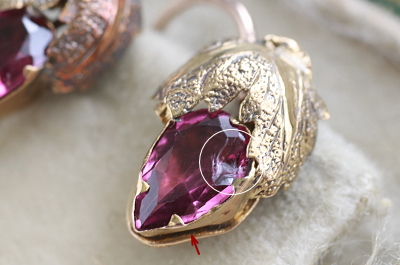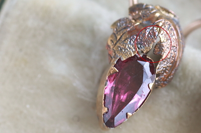 ★A&C15723 アルマンディンガーネットピアス Victorian 5.8~6.5×16~16.5mm(片方0.4g) / sold 天然ガーネット / K15ゴールド / K6ゴールド(フック) 送料:Aランク 【送料ページはこちら】 ◆ご注文方法はこちら◆ 甘い果実のような、赤紫の瑞々しい煌めきが耳に揺れる、アルマンディンガーネットのピアス。ガーネットが収まるフレームや、エングレービングが施されたガクの部分は、K15ゴールドのリッチな金色で、実りの喜びを感じさせる豊かな輝きです。 片方のガクの部分に凹み、もう片方のガーネットに欠け、フレームに歪みが見られるのは残念ですが、強度的にしっかりしており、ヴィクトリア時代のきれいな石色のアルマンディンガーネットを、気軽に愉しんでいただけるピアスだと思います。19世紀のイギリスから。 刻印は有りませんが、フレームやガクはK15ゴールド、フックはK6ゴールドでテスト済みです。ガーネットの欠けやゴールドの歪みが見られるものの、あまり目立ちません。写真のアンティークケースは付属しません。 いろいろなデザイン、貴石のピアス、イヤリングをご紹介しています。ページ下部のリンクからご覧ください。 |