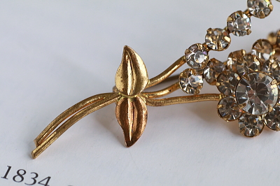 ★A&C15726 ラインストーンの花のブローチ W27×H58mm(4.3g) / ガラス / メタル 送料:Aランク 【送料ページはこちら】 定形外郵便対応【ご注文時にお申し付けください】 ◆ご注文方法はこちら◆ 明るくクリアに輝くラインストーンで、デイジー型のお花を象る愛らしいブローチ。花の横に連なる小粒は蕾でしょうか、金色のメッキのフレームに、鮮やかな煌めきを愉しめる、お天気の日に身に着けたくなるひと品です。20世紀中期のヨーロッパ製。 特に目立つダメージの見られない、きれいなしっかりした状態です。写真のアンティークケースは付属しません。 他にも様々なデザインのコスチュームジュエリーをご紹介しています。ページ下部のリンクからご覧ください。 |