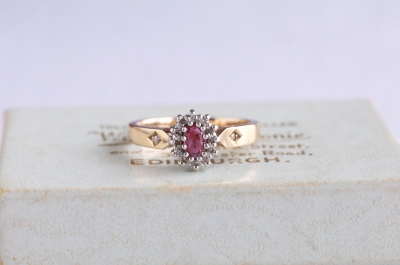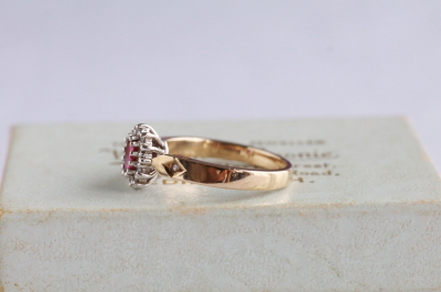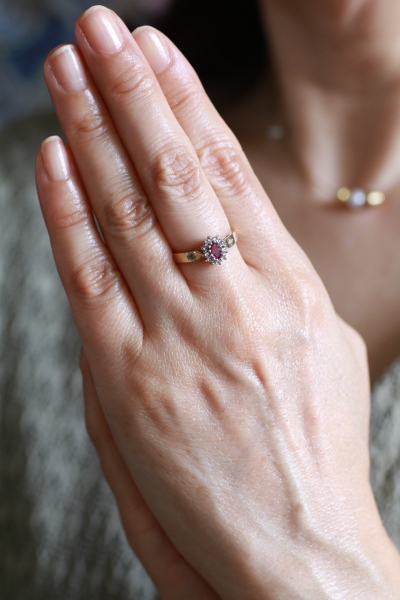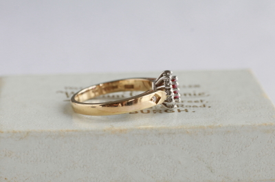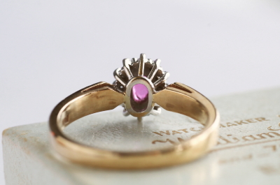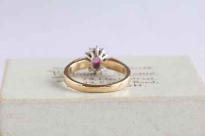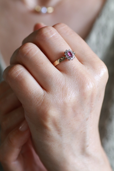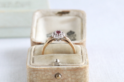 ★A&C15731 オーバルルビー&ダイヤモンドリング Birmingham 1994 サイズ13号弱(3.0g) / ¥43,000.-〔税込み〕 天然ルビー / 天然ダイヤモンド / K9ゴールド 送料:宅配便送料無料(3万円以上) ◆ご注文方法はこちら◆ オーバルカットのルビーはピンクの石色の鮮やかな深みと、透明感を両立する美しい煌めき。周りをメレダイヤが花弁のように取り巻く、花のようなフェイスの中央で、ルビーの熟したようなつややかさが魅力のリングです。ホールマークから1994年のイギリス、バーミンガム製と分かちヴィンテージリングは、しっかりとしたシャンクの厚みや、きちんとした作りの丁寧さも好ましい。 ルビーの小さな欠けが見られますが、爪に隠れてあまり目立ちません。それ以外は全体にきれいなしっかりした状態です。写真のアンティークケースは付属しません。 様々なデザインのルビーリングをご紹介しています。下部のリンクからご覧ください。 |