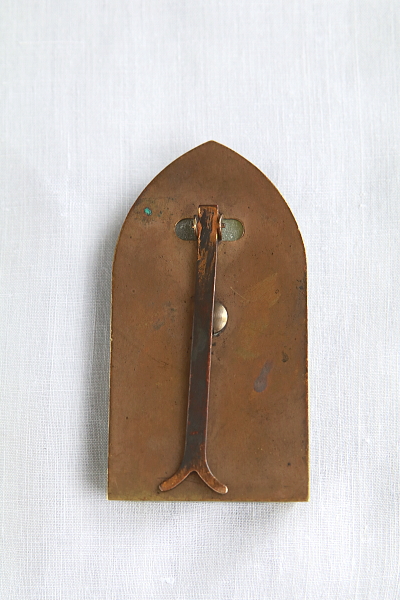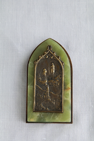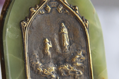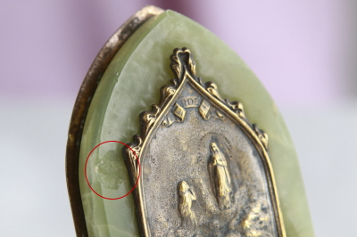 ★A&C15733 ルルドのオラトリー グリーンマーブル W4.8,D1,H9.5cm / sold 送料:Aランク 【送料ページはこちら】 ◆ご注文方法はこちら◆ ルルドの泉にて、少女ベルナデッタの前に顕現した聖母のお姿や、大聖堂の威容をレリーフに浮かび上がらせるオラトリー。奇跡の光景を真鍮の金色に描いて、ベースのグリーンマーブルの色合いと相まって、清らかな輝きを愉しめるひと品。聖地ルルドへ訪れた記念に人々が求めた小さな聖具は、長年祈りを受け止めてきた故か、経年の表情にも味わいを感じるアンティークのムードが魅力的です。20世紀前期のフランスから。 マーブルに薄い欠け、キズが見られますが、強度的な問題はなくあまり目立ちません。 様々な素材、題材のオラトリーをご紹介しています。下部のリンクからご覧ください。 |