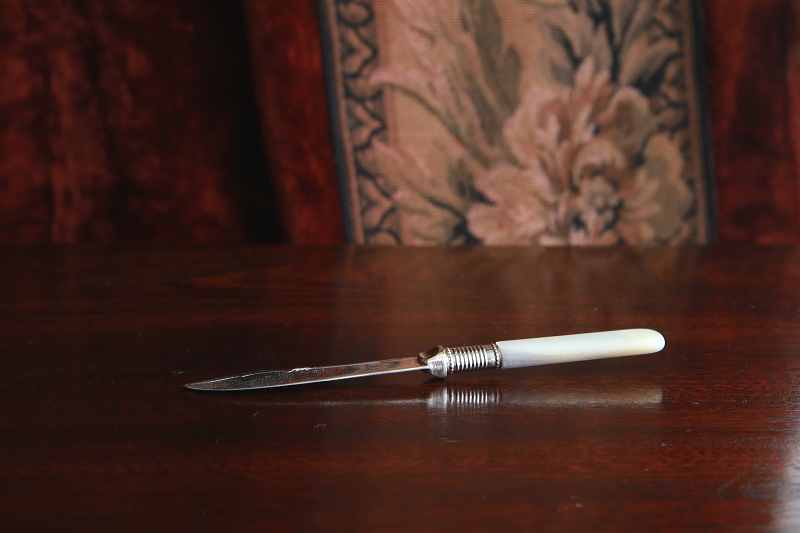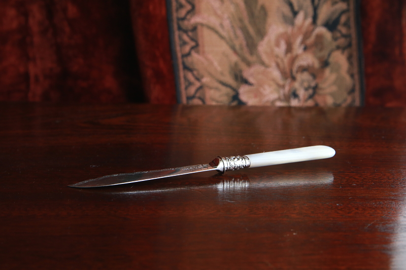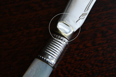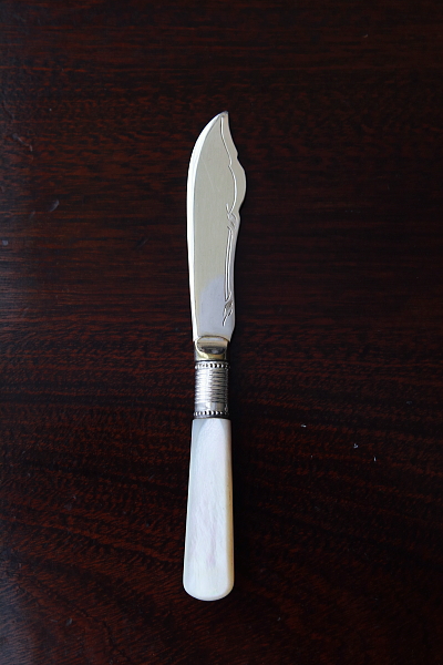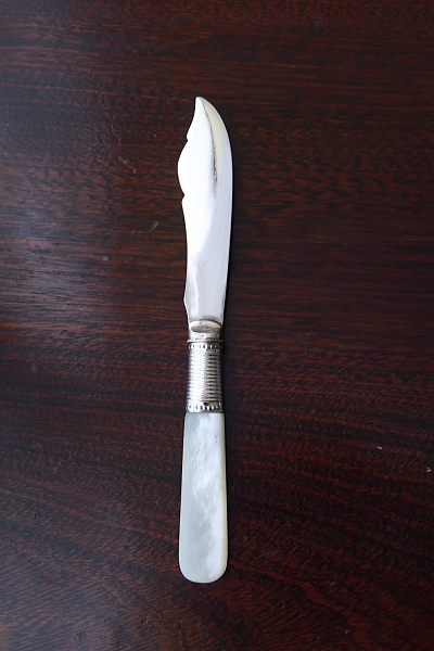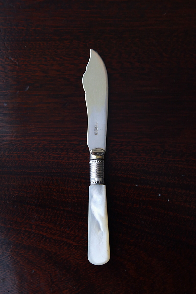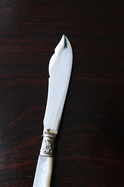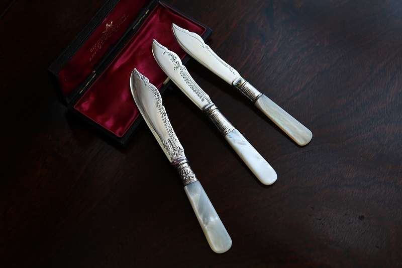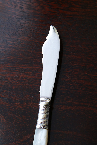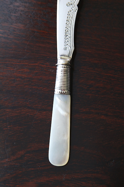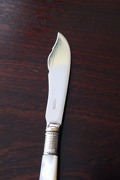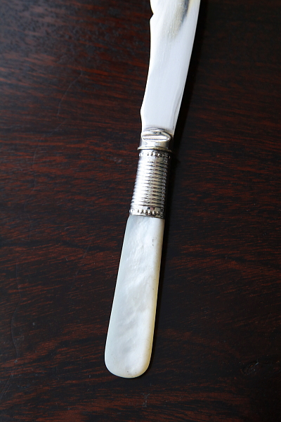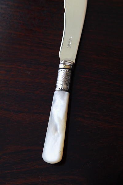 ★A&C15738 マザーオブパールハンドル バターナイフ A&C15738-A:L15cm(27g) / sold A&C15738-B:L13.8cm(19g) / sold A&C15738-C:L13.4cm(20g) / sold 送料:Aランク 【送料ページはこちら】 定形外郵便対応【ご注文時にお申し付けください】 ◆ご注文方法はこちら◆ バターはもちろん、スコーンを切ったりクロテッドクリームを塗ったり、お茶の時間に活躍するシルバープレートのバターナイフ。マザーオブパールのハンドルが有機的な輝きで目を楽しませ、持ちやすい円みも手に心地よい。ブレードに施されたハンドエングレービングの模様が、ナイフそれぞれの表情を引き立て、使い込むほどに愛着の湧きそうなバターナイフ達。毎日の朝ごはんにも、少しあらたまったお茶の時間にも似合う、素材の良さと作りの美しさがお勧めどころです。19世紀末から20世紀初期の品々です。イギリス製。 B,Cのブレードの付け根、膨らんだ部分にわずかにシルバープレートの摩滅が見られます。シルバープレート表面に何れも小キズが見られますが、あまり目立ちません。ブレードとハンドルをニカワで接着していると思われます。湯水に長時間浸けたり煮沸すると、ニカワが溶けますので注意して下さい。食洗機不可。 様々な素材、デザインのティーナイフ、バターナイフをご紹介しています。下部のリンクからご覧ください。 |