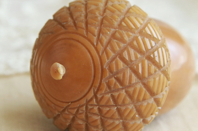 ★A&C15744 エイコーンのソーイングセット W35×H58mm / 送料:Aランク 【送料ページはこちら】 ◆ご注文方法はこちら◆ 幾分か経年の表情も愉しめる、つやつやと滑らかな光沢の、ベジタブルアイボリーと呼ばれる硬いヤシの種を彫り上げた品。エイコーンの帽子を外すと中には白糸と黒糸を巻いたボビンと銀の指貫が収められた贅沢なソーイングセットになっています。ヴィクトリア期のイギリスで、レディーの嗜みとして携行された品でしょう、かわいい形状と、ベジタブルアイボリーのナチュラルな素材感がこのましい、自慢のコレクションになりそうな手芸小物です。19世紀のイギリスから。 蓋のヘタにごく小さな欠けが見られますが、それ以外に特に目立つダメージの見られない、きれいなしっかりした状態です。 様々な意匠を凝らした手芸道具をご紹介しています。下部のリンクからご覧ください。 |