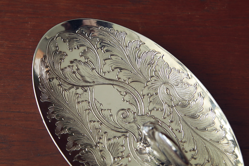 ★A&C15748 リスのヴィンテージトレイ W20.5,D12,H5.5cm / 送料:Aランク 【送料ページはこちら】 ◆ご注文方法はこちら◆ 植物模様が浮かび上がるシルバープレートの小皿に、ちょこんと止まるリスが可愛らしい。イギリスで身近な動物として愛され、リスのトレイも今までに色々と扱ってきました。今回はリスのモダンな造形に、シルバープレートの輝きがよく似合うひと品。鍵やアクセサリーの小皿に使いやすいサイズや、しっかりとした持ち重りや、底のフェルト貼りも好ましいヴィンテージトレイです。20世紀後期のイギリスから。 写真のアクセサリーは付属しません。特に目立つダメージの見られない、きれいなしっかりした状態です。 ウサギやネコのエッグカップなどご紹介しています。下部のリンクからご覧ください。 |