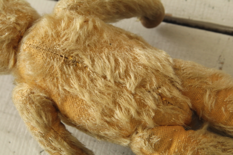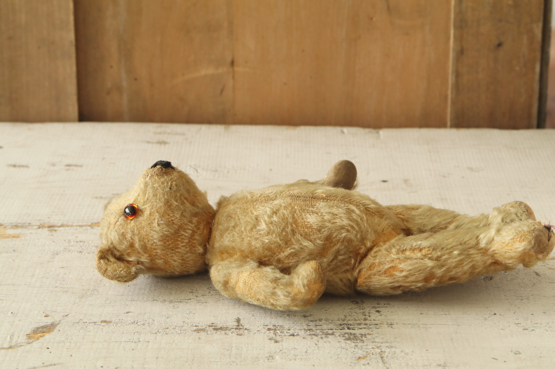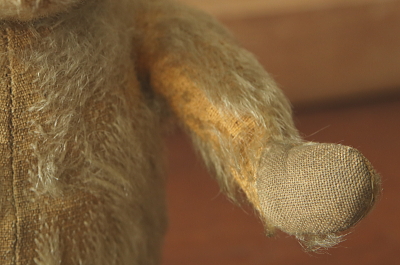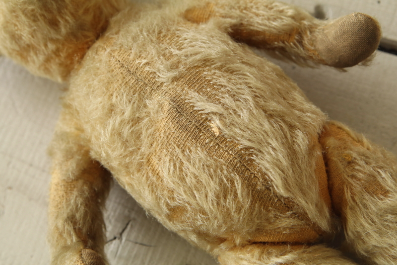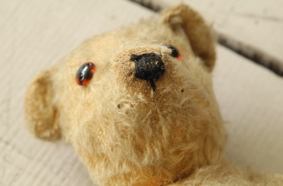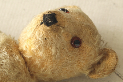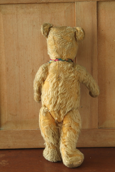 ★A&C15759 オールドテディベア T31cm / ¥23,600.-〔税込み・送料別〕 送料:Aランク 【送料ページはこちら】 ◆ご注文方法はこちら◆ 鼻面の尖った中々スマートなお顔立ち。つぶらなオレンジのグラスアイに、黒い鼻のステッチ、お耳の立ち方の不揃いや、長年可愛がられて来たことを偲ばせる、ところどころ毛の抜けた古びた表情も魅力的。右の爪先の繕い跡など、一生懸命直してくれたなと感じて微笑ましい。1940年代頃のおそらくイギリスのメーカーの品だと思います。 口のステッチがなくなっています。首と手足のジョイントも回ります。頭部の詰め物はウッドウールで、体と手足の詰め物はパンヤです。 他にもベアなどのぬいぐるみをご紹介しています。下部のリンクからご覧ください。 |
